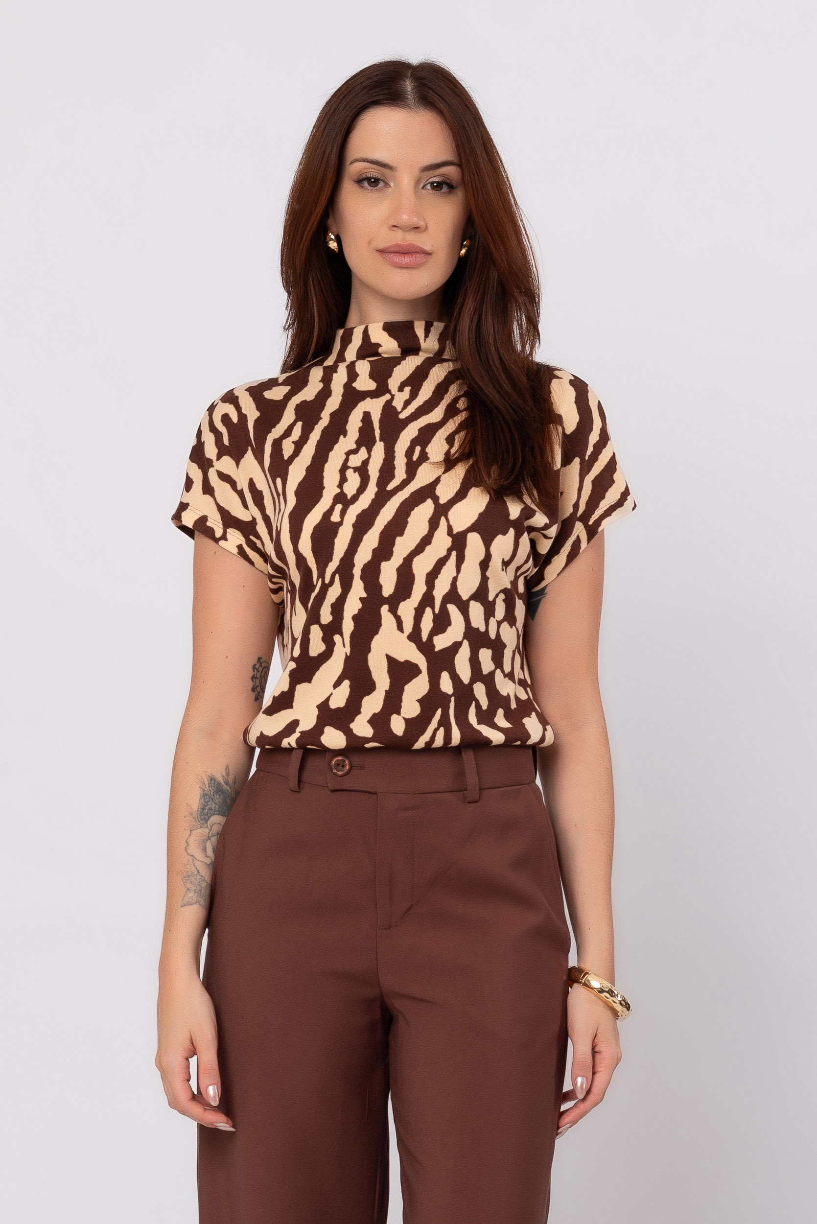 O mix de cores em brown e bege transforma essa blusa em uma peça chave para diversas ocasiões — desde produções casuais do dia a dia até looks mais elaborados para encontros e eventos sociais. O design leve e a modelagem confortável tornam essa blusa um item indispensável para mulheres que querem versatilidade sem abrir mão do estilo.