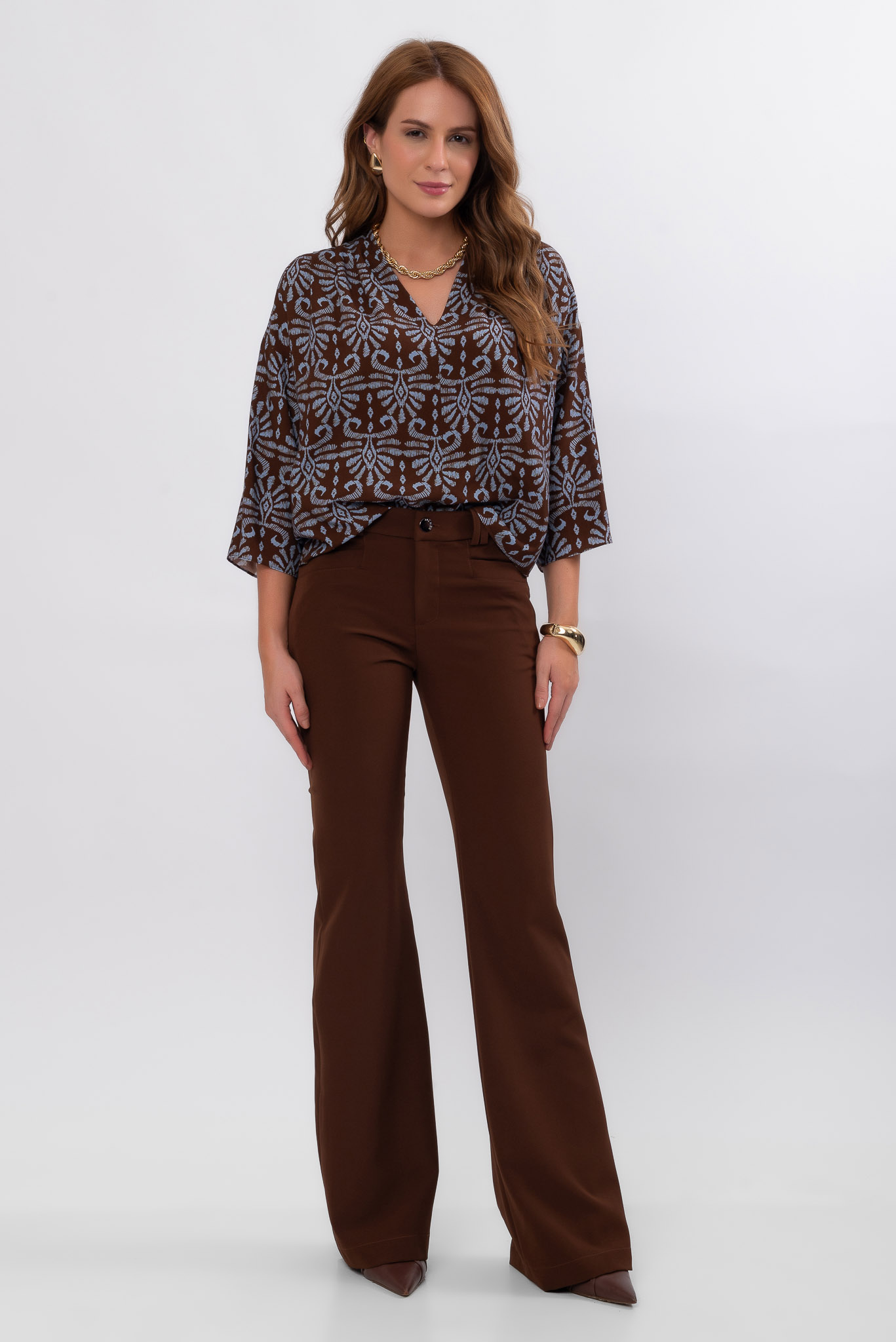 O tom Chocolate Sauce (marrom sofisticado) é uma tendência atemporal da moda feminina, fácil de combinar com camisas, blusas elegantes, croppeds ou blazers. Essa calça flare marrom feminina é perfeita para compor looks para trabalho, eventos, jantares ou produções sofisticadas do dia a dia.