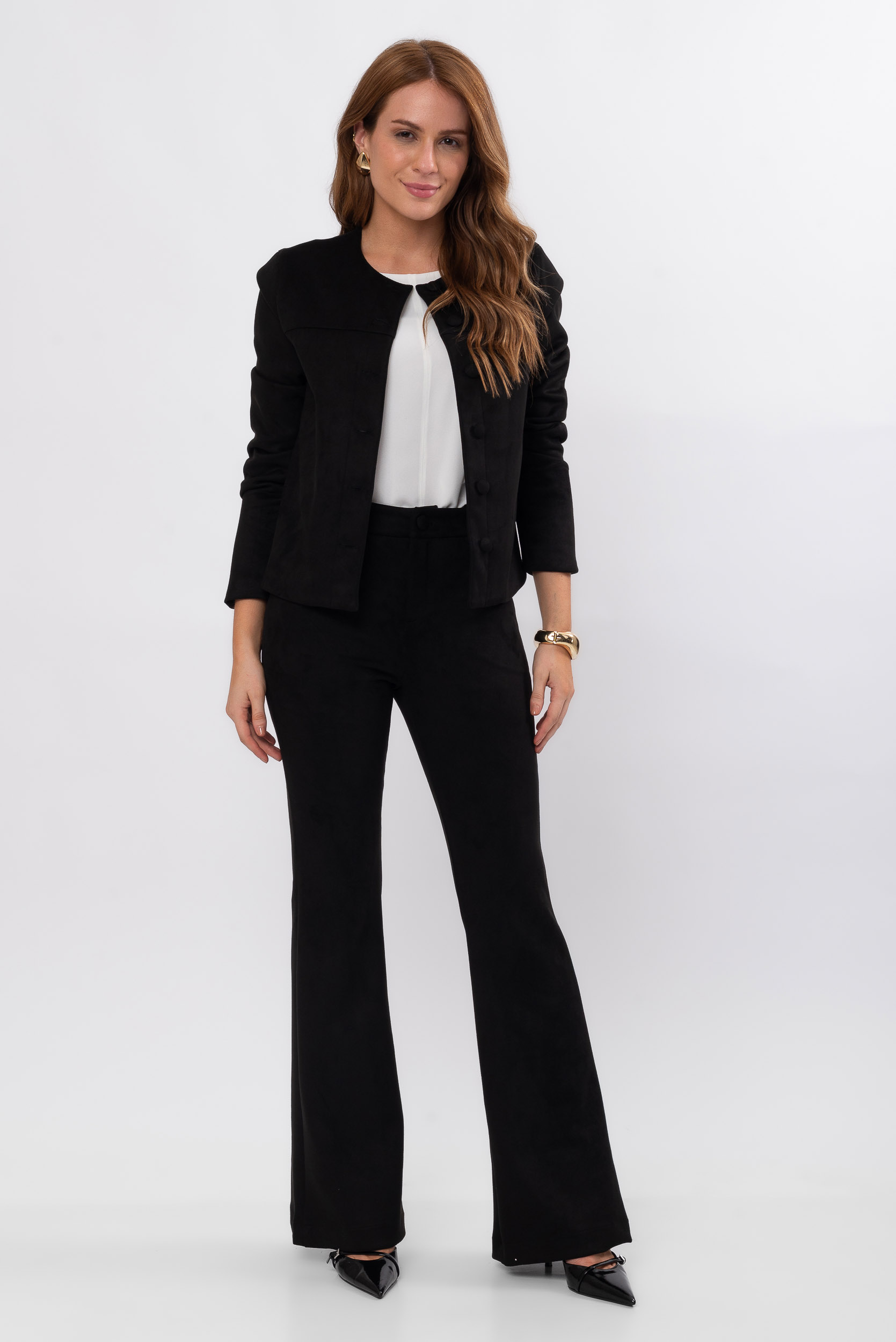 A calça flare suede preta é uma peça essencial para quem busca elegância e estilo em qualquer ocasião. O modelo Bia é confeccionado em suede, um tecido com toque macio e aveludado que proporciona conforto e sofisticação ao look.