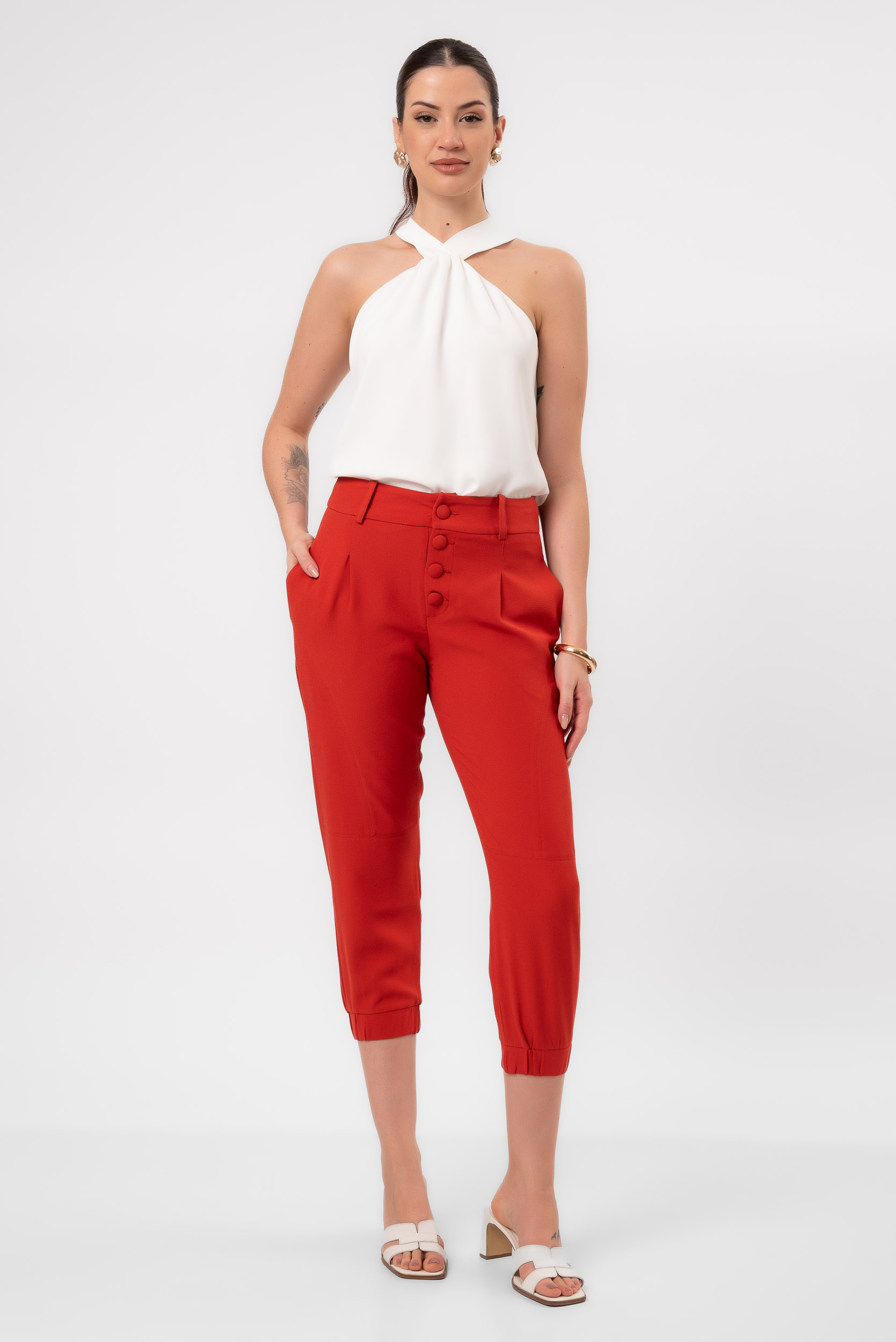 A Calça Jogger Dri, possui modelagem de calça cropped, com botões forrados e elastico na barra. Se você quiser criar um look casual ou de passeio, essa peça é perfeita para você.