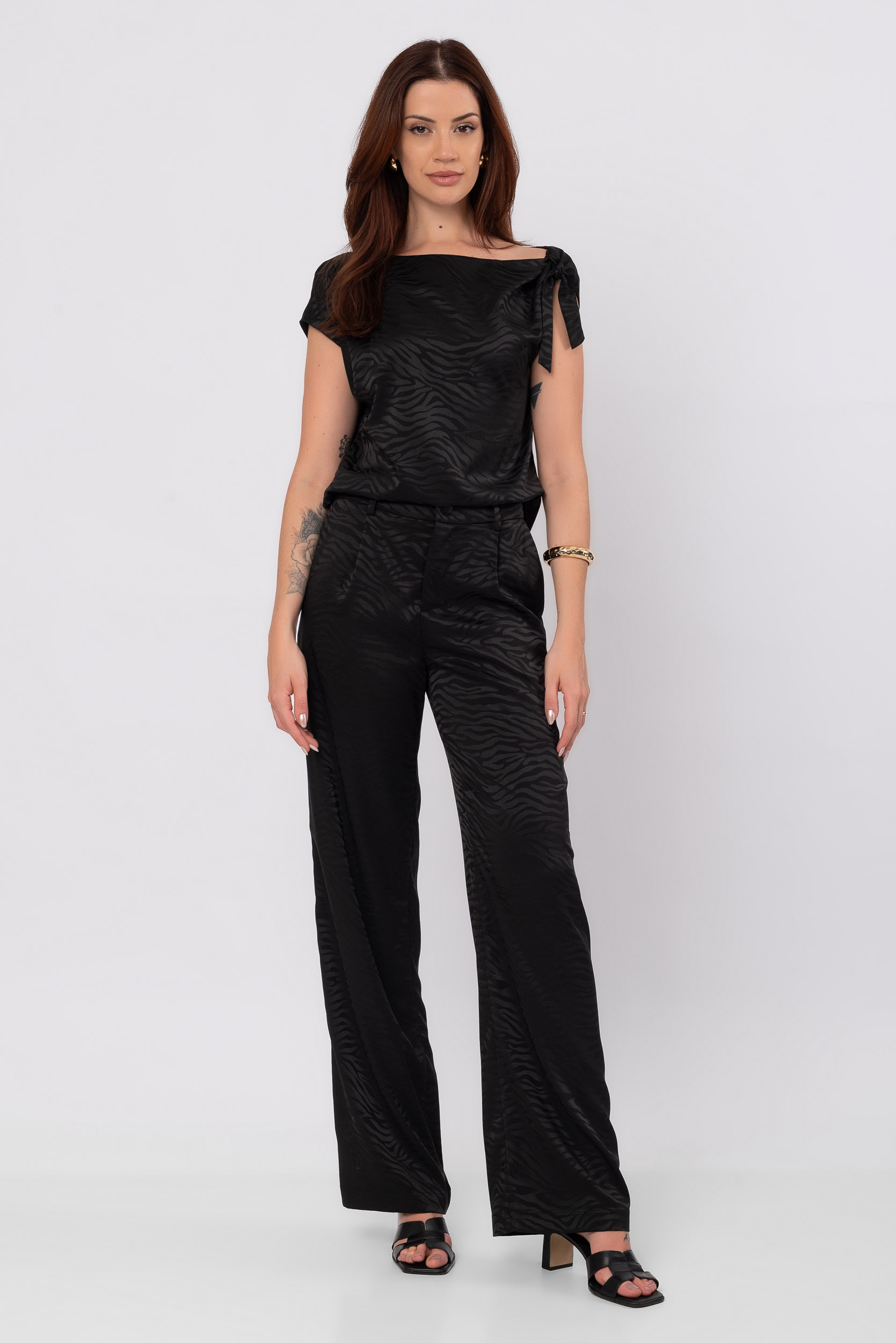 O destaque da peça fica por conta do detalhe animal print, que traz um toque contemporâneo ao visual sem perder a elegância do preto clássico. Essa combinação cria um equilíbrio perfeito entre sofisticação e modernidade.