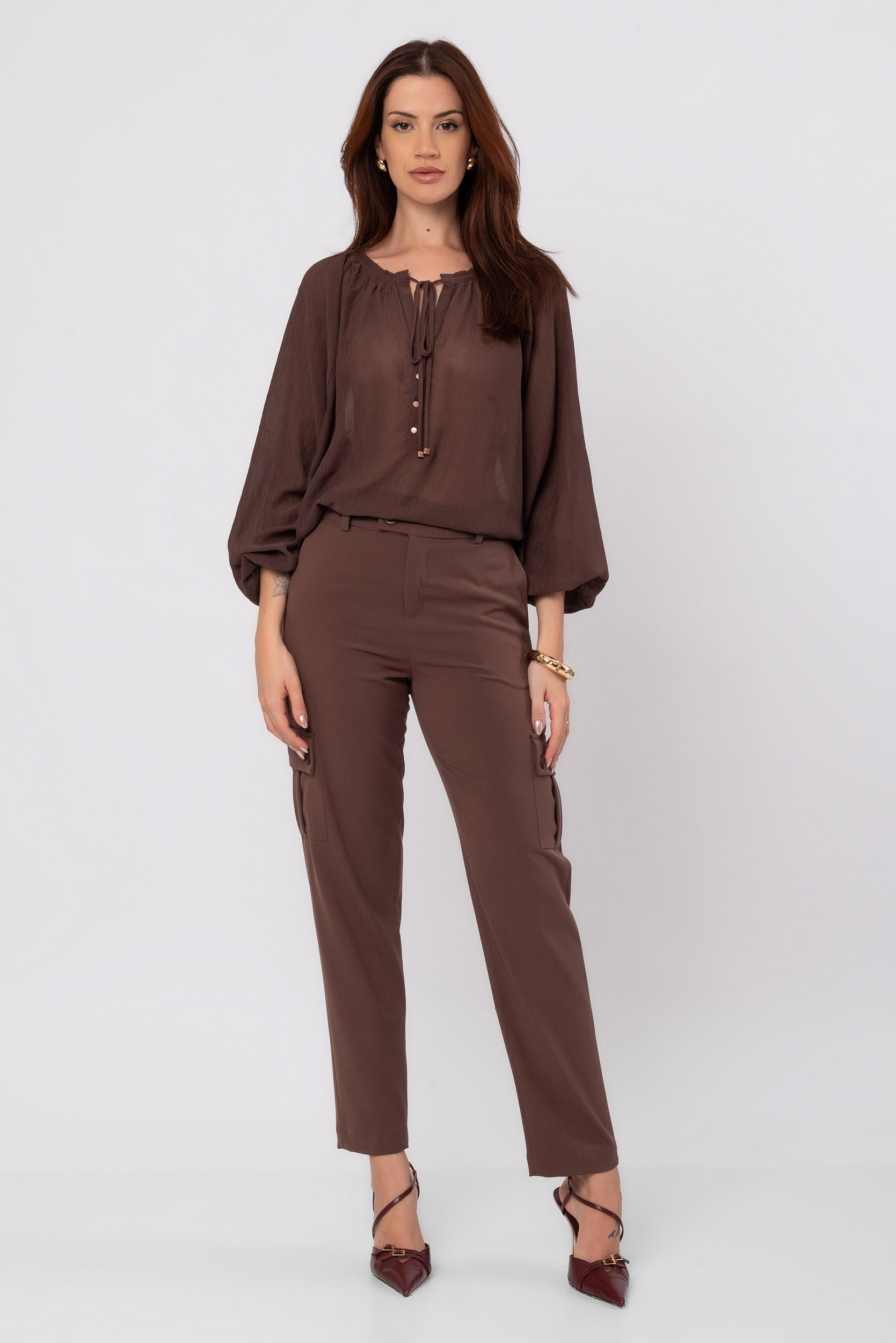 A cor cacau (marrom) traz um tom sofisticado e versátil ao look, fácil de combinar com blusas, t‑shirts, camisas ou jaquetas, criando produções que vão do casual chic ao urbano contemporâneo. Seja para o trabalho, um passeio no fim de semana ou uma saída à noite, esta calça se torna um item curinga no guarda‑roupa feminino.