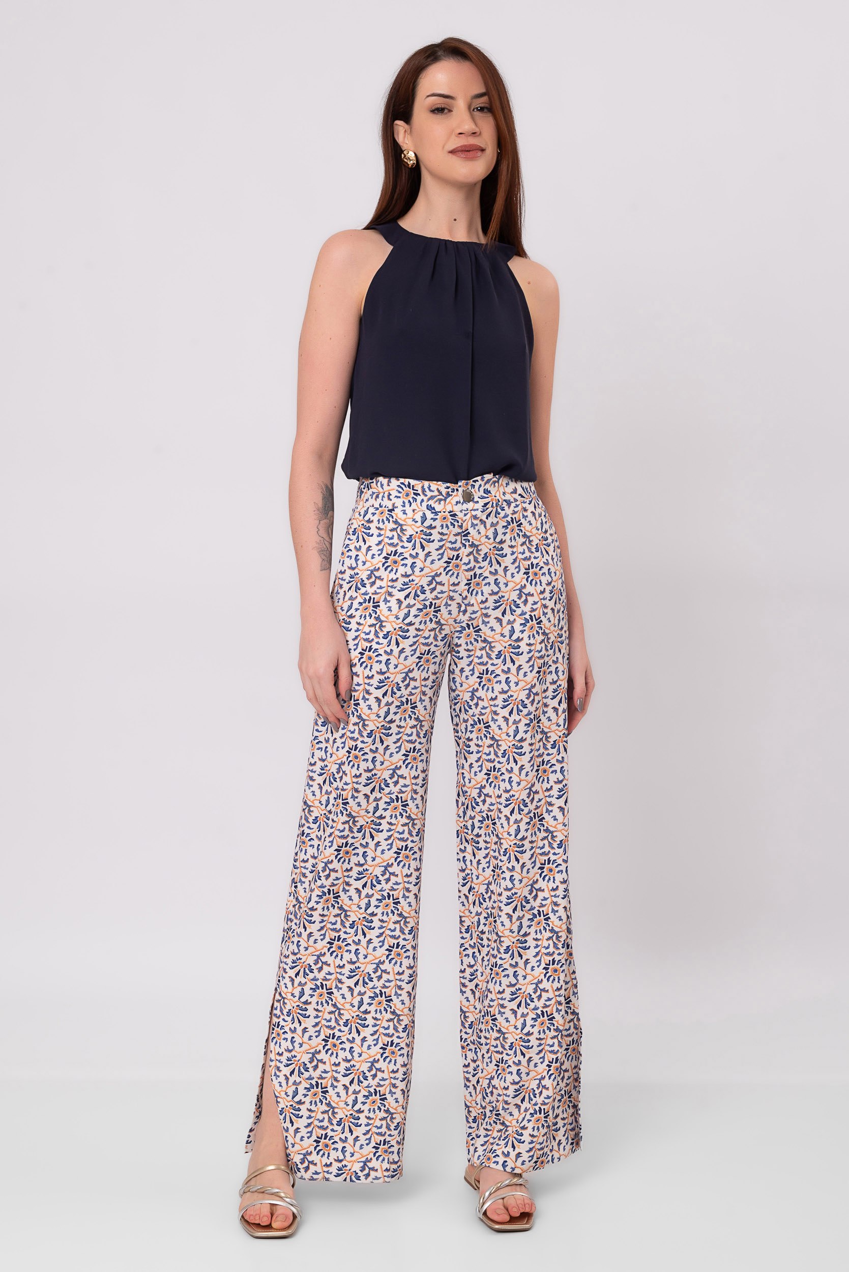 A Calça Pantalona Vanessa é confeccionada em crepe, com a modelagem de pantalona. A peça possui movimento, estampada com elastano. Estampa exclusiva All Side.
