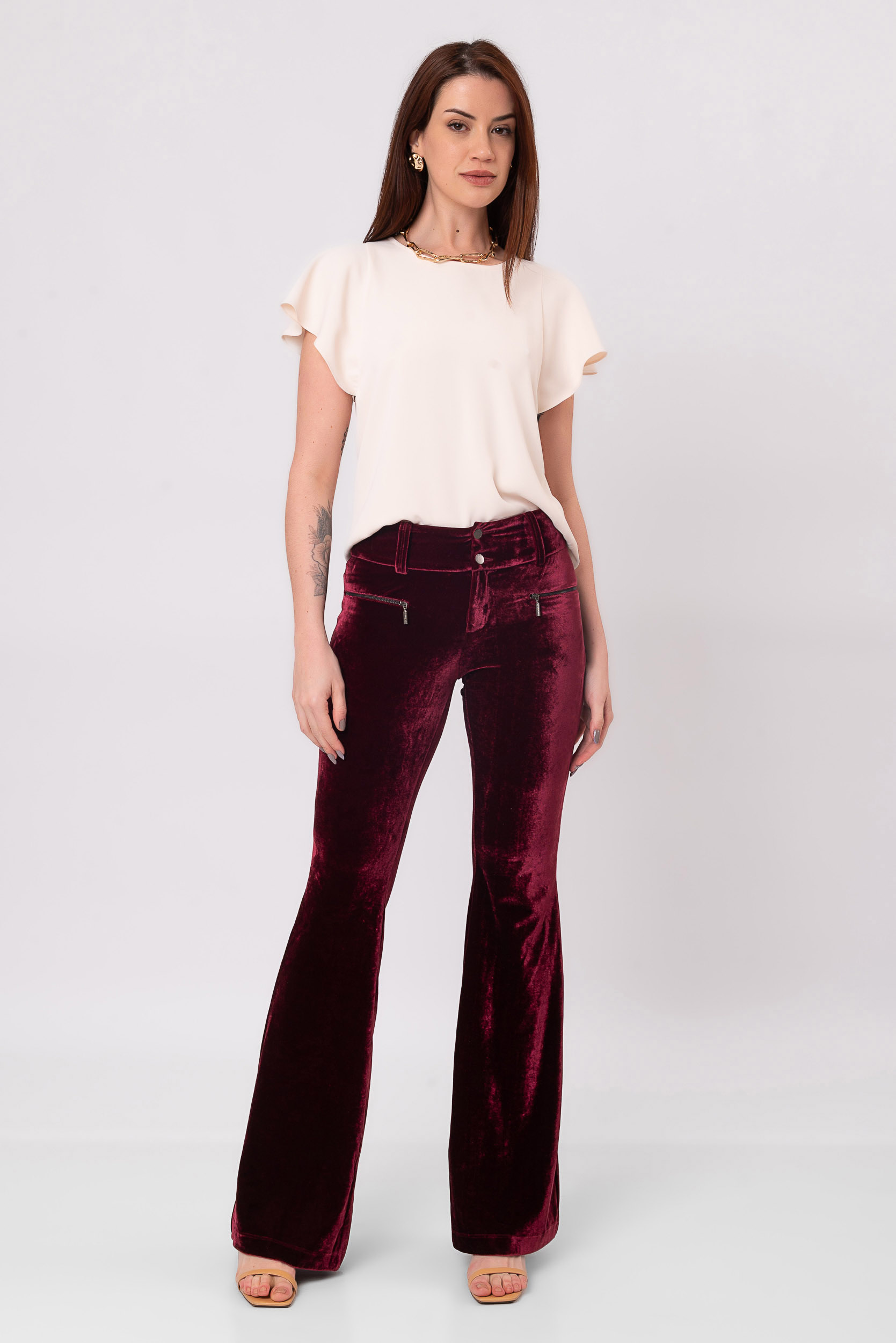 Composta por poliéster e elastano, a Calça Veludo Velvet, foi confeccionado em veludo molhado, possui modelagem flare e detalhes de zíper na parte frontal. Traz a você uma maciez, conforto e elegância própria para deixar-lhe ainda mais bela.