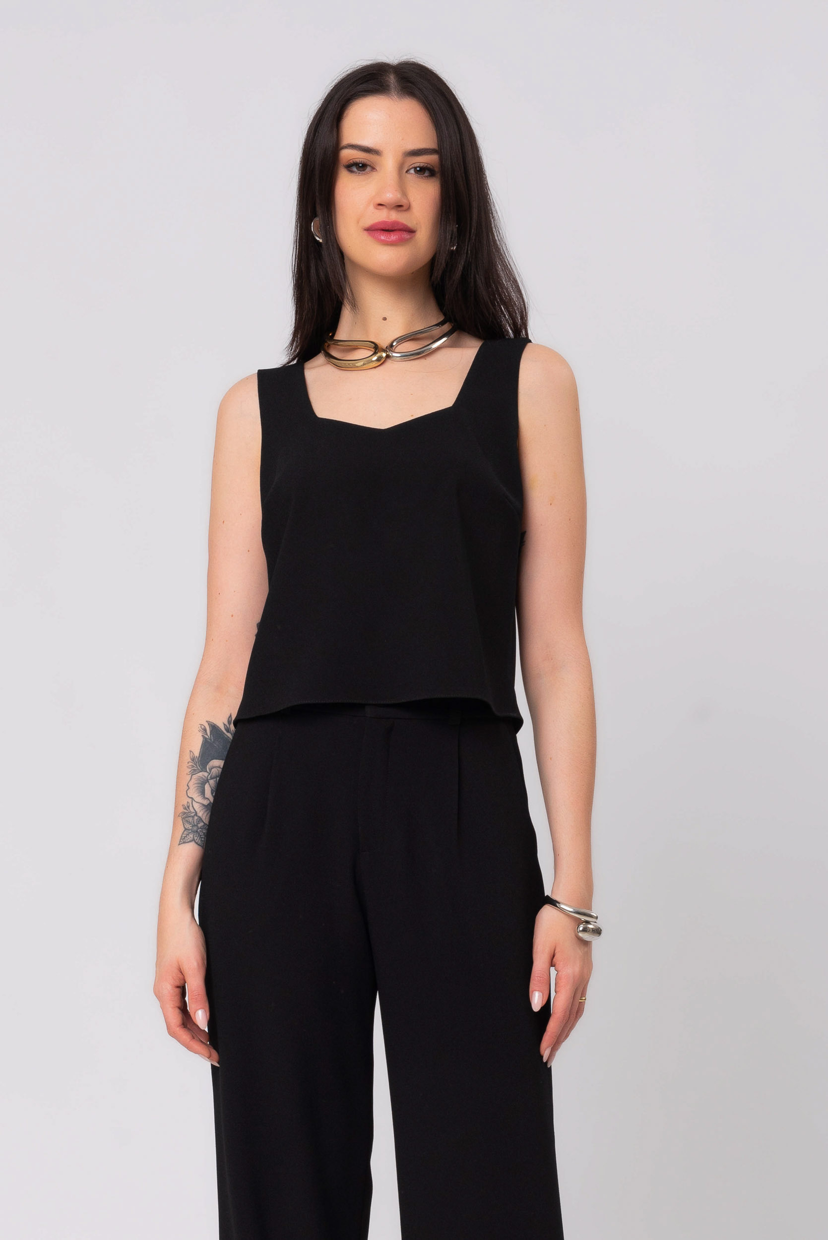 A regata de crepe alfaiataria preta é a peça essencial para quem busca elegância e versatilidade no dia a dia. Com design minimalista e acabamento refinado, ela entrega um visual moderno que transita facilmente entre o casual e o social.