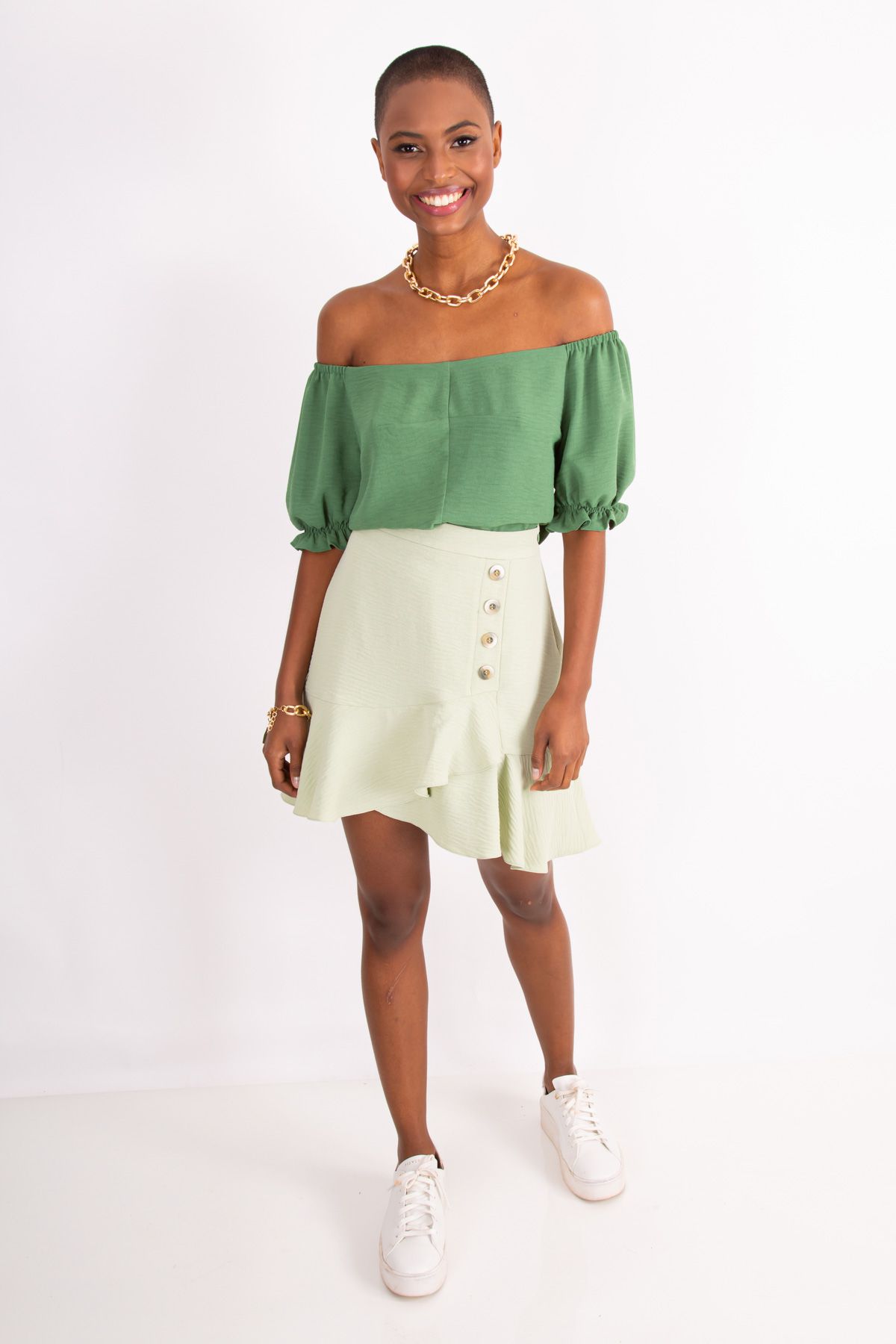 A Saia Olívia é confeccionada em crepe, possui modelagem saia curta com babado transpassado na barra que traz movimento a peça. Shape leve e fluido e detalhe em botões laterais que agregam charme total ao look. Fechamento em zíper lateral.