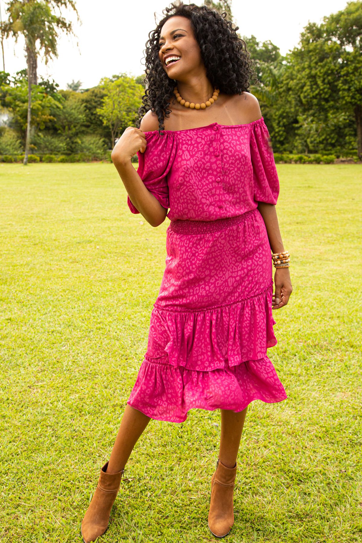 Composta por poliéster, a Saia Andreza possui modelagem midi, com uma leve estampa em toda peça, além de lastex no cós. Camadas de babado que deixam a peça cheia de movimento e charme. Combine com as partes de cima confeccionadas no mesmo tecido.