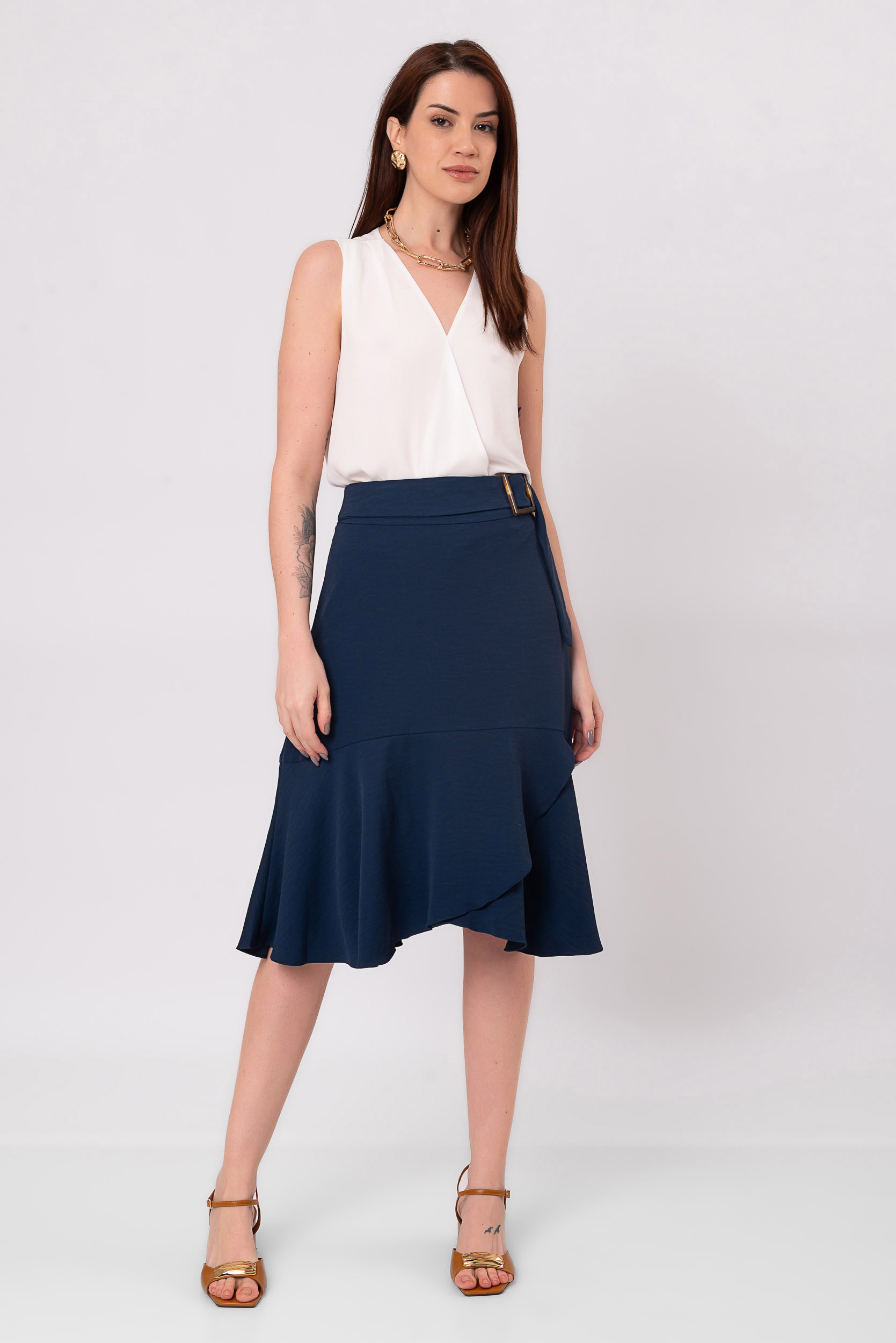 A Saia Midi Italia é confeccionada em crepe, com a modelagem midi e básica. A peça possui o cinto no mesmo tecido e comprimento midi. Movimento do babado.