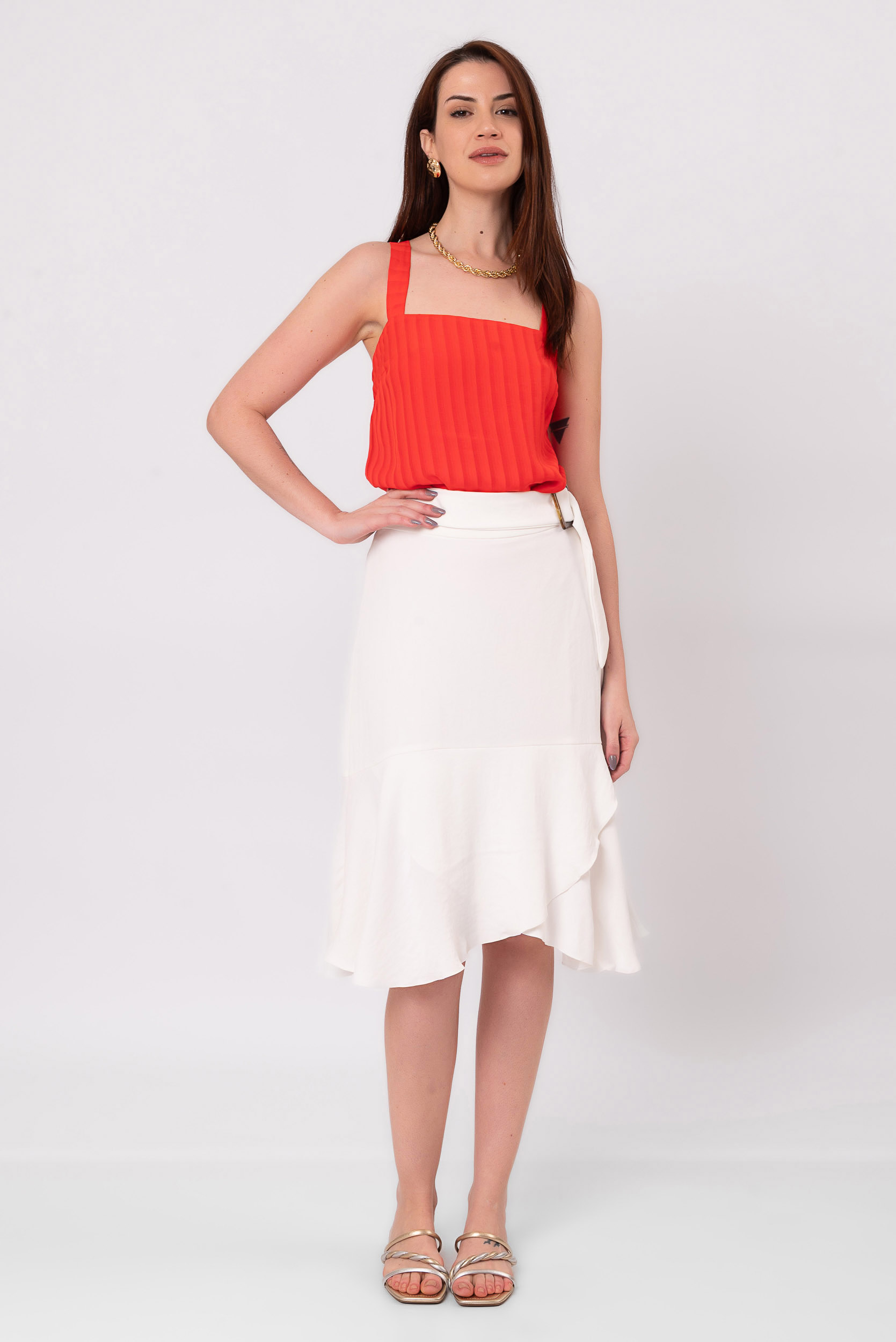 A Saia Midi Italia é confeccionada em crepe, com a modelagem midi e básica. A peça possui o cinto no mesmo tecido e comprimento midi. Movimento do babado.