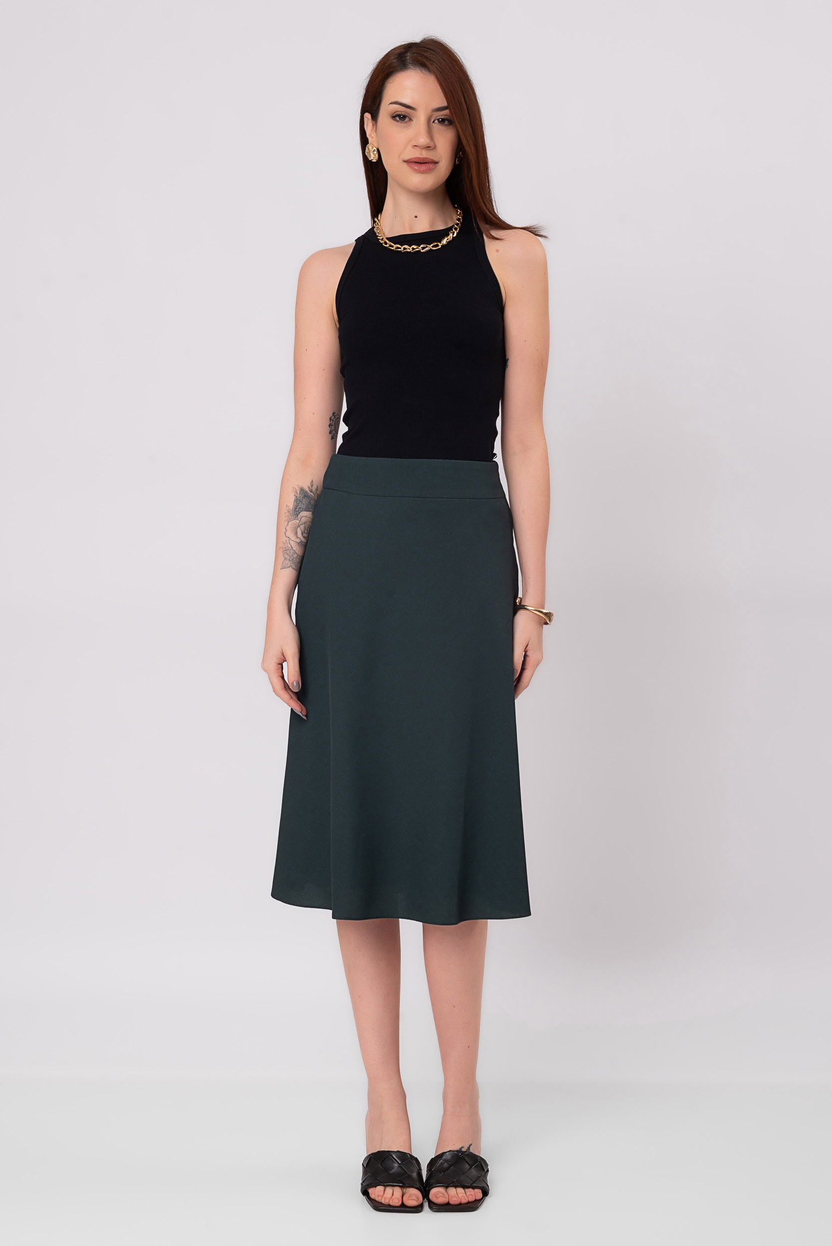A Saia Feminina Midi Londres Verde Floresta é confeccionada em tecido crepe, com a modelagem midi e básica. A peça possui um movimento e zíper lateral.