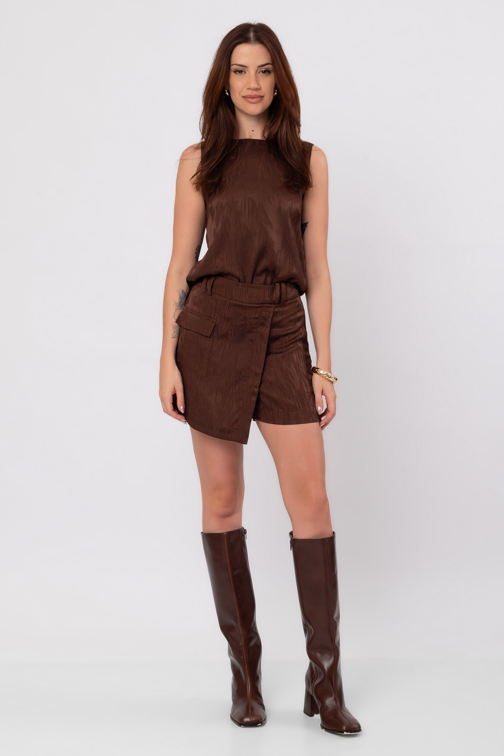 O short saia Milão chocolate é a escolha perfeita para quem busca elegância e praticidade em um único look. Com design moderno e acabamento em alfaiataria, ele combina o visual sofisticado da saia com o conforto e segurança do short interno.