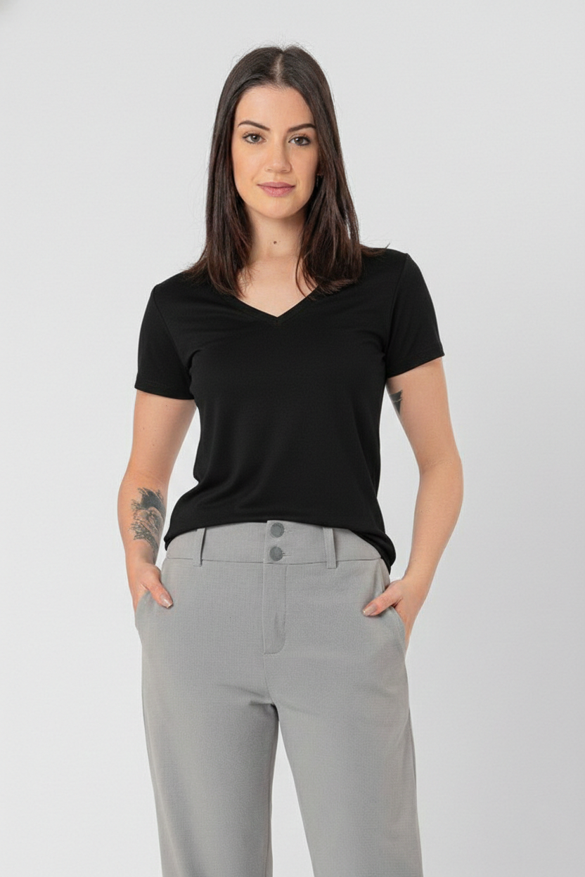 T-shirt com decote V e corte acinturado, pensada para realçar a forma feminina com leveza. Confortável e charmosa, é ideal para quem busca praticidade sem abrir mão do estilo.