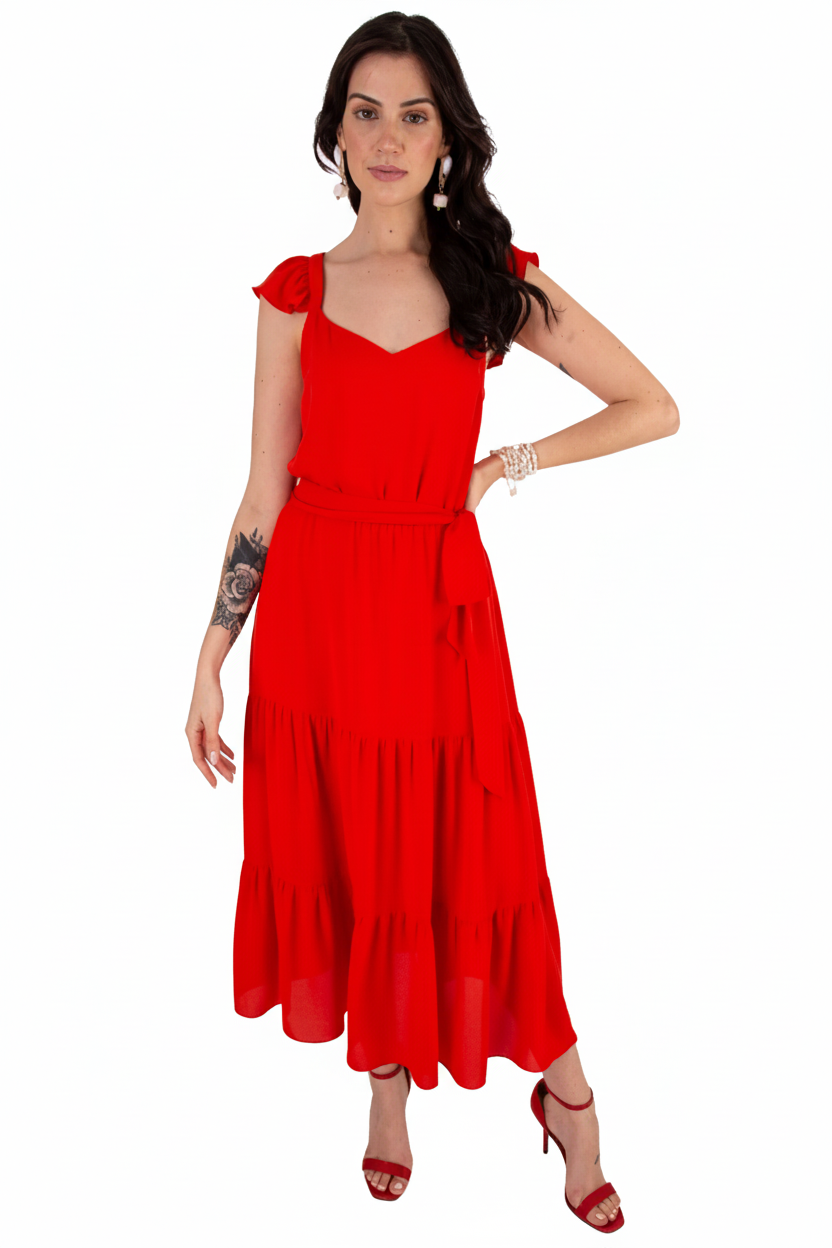 No quesito beleza, o Vestido Catherine Crepe Mikonos Vermelho é longo e bem soltinho, deixando a sua pele respirar nos dias quentes e o laço na cintura serve tanto para trazer um charme a mais quanto no ajuste ao corpo. E outra: a alça curta, o suave decote em V e os babados nas barras e na alça trazem delicadeza a todos os looks.