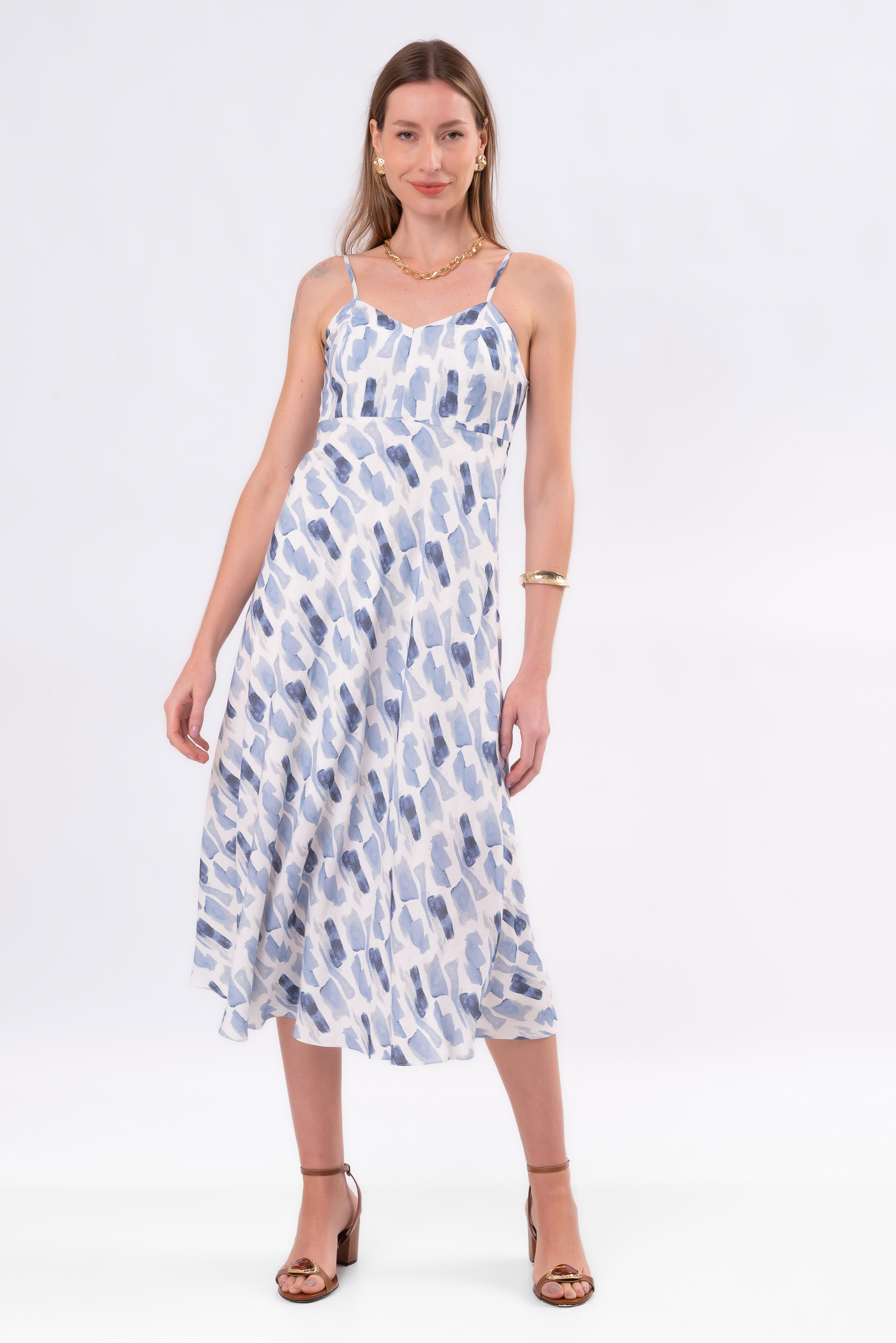 Vestido midi estampado em fundo off‑white com detalhes azul. allsidestore.com.br